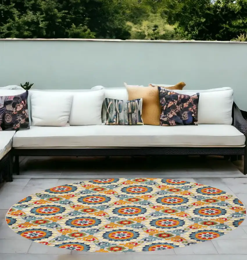 The 8' round rug is manufactured from high-grade materials, perfect for consistent outdoor usage. It withstands various weather conditions without losing it vibrant color or intricate design.
