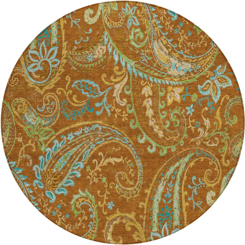 8' Round Orange Round Paisley Washable Non Skid Indoor Outdoor Area Rug
