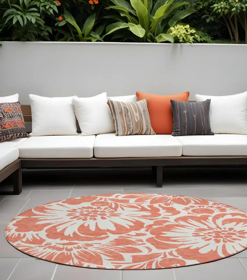 8' Round Salmon and Ivory Round Floral Washable Non Skid Indoor Outdoor Area Rug