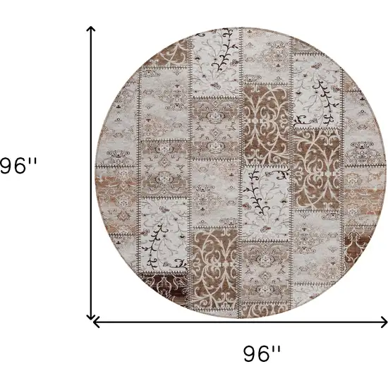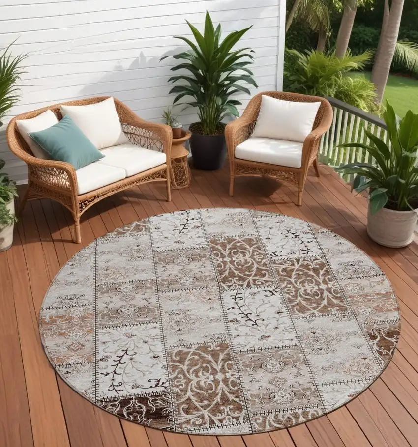 Set an inviting tone in your space with this 8-foot round taupe and ivory round patchwork washable stain resistant non skid indoor outdoor area rug. This geometric round shaped rug features a patchwork pattern in taupe and ivory that combines a good looking print with a unique and updated shape. The mix of shape, color, and design gives this rug refreshing visual interest. Ideal for spaces with kids and pets, this rug is stain resistant to help repel stains and spilled liquids. Area rugs help to give warmth and sense of home to your space. 96-inch H x 96-inch W x 0.19-inch D