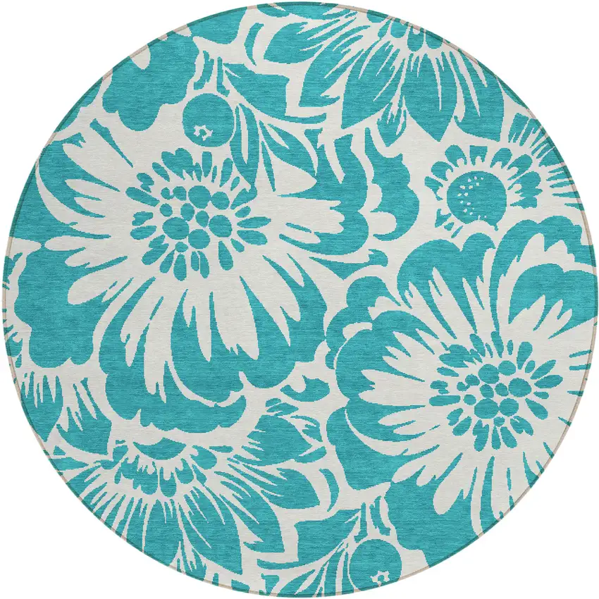 8' Round Teal and Ivory Round Floral Washable Non Skid Indoor Outdoor Area Rug
