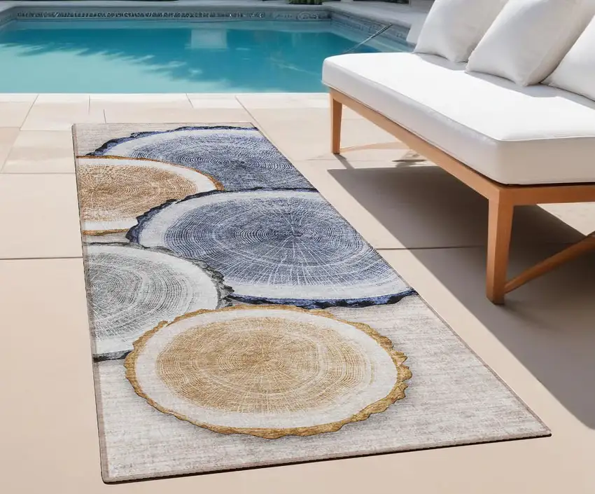 Set an inviting tone in your space with this 8-foot runner beige blue and gold faux bois washable stain resistant non skid indoor outdoor runner rug. This runner shaped rug features a faux bois design in beige blue and gold to give it visual interest. A classic shape marries with good looking design for your space ideal for spaces with kids and pets, this rug is stain resistant to help repel stains and spilled liquids. Place this area rug against a hardwood or tile floor and it will enliven your living space with style and sophistication. 27-inch H x 90-inch W x 0.19-inch D