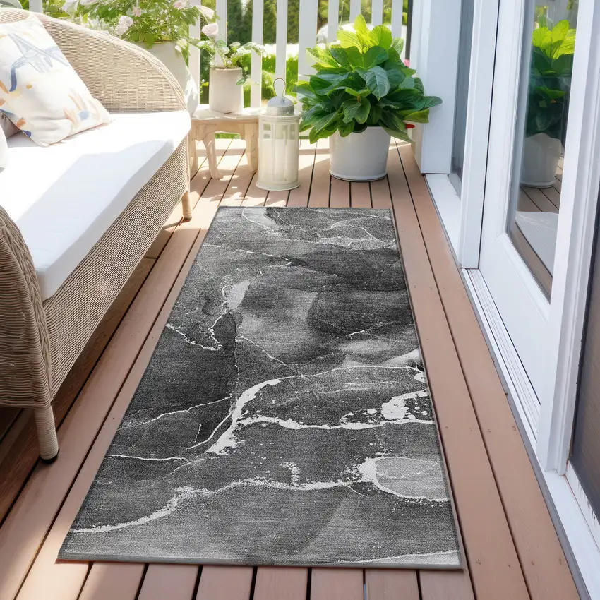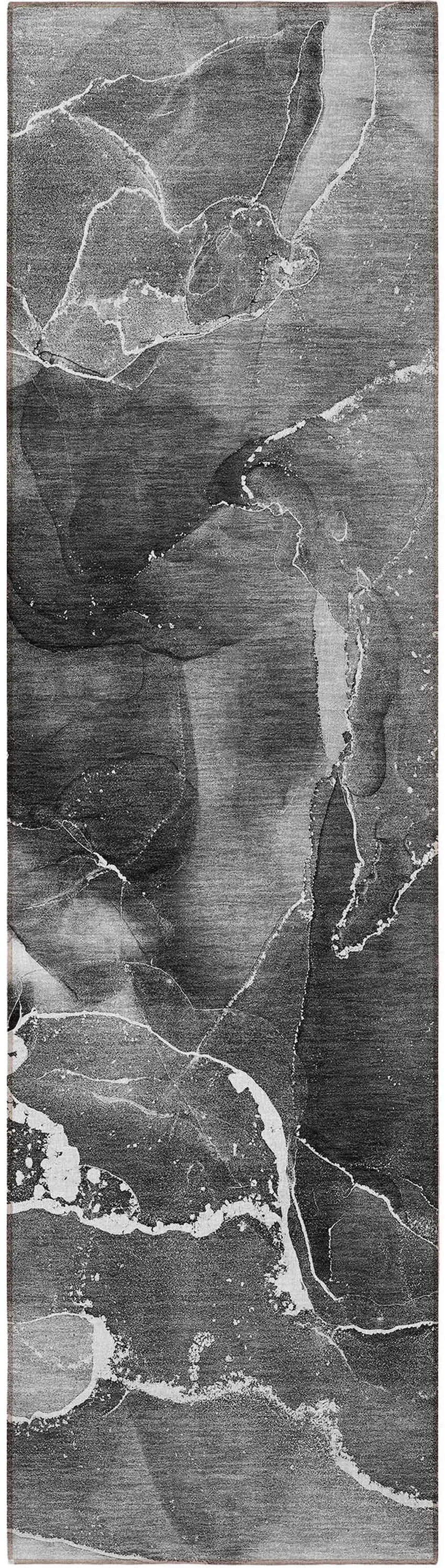 Add some artistry to your room with this 8-foot runner black gray and white abstract washable stain resistant non skid indoor outdoor runner rug. This runner shaped rug features a abstract design in black gray and white to give it visual interest. A classic shape marries with good looking design for your space ideal for spaces with kids and pets, this rug is stain resistant to help repel stains and spilled liquids. Area rugs help to give warmth and sense of home to your space. 27-inch H x 90-inch W x 0.19-inch D
