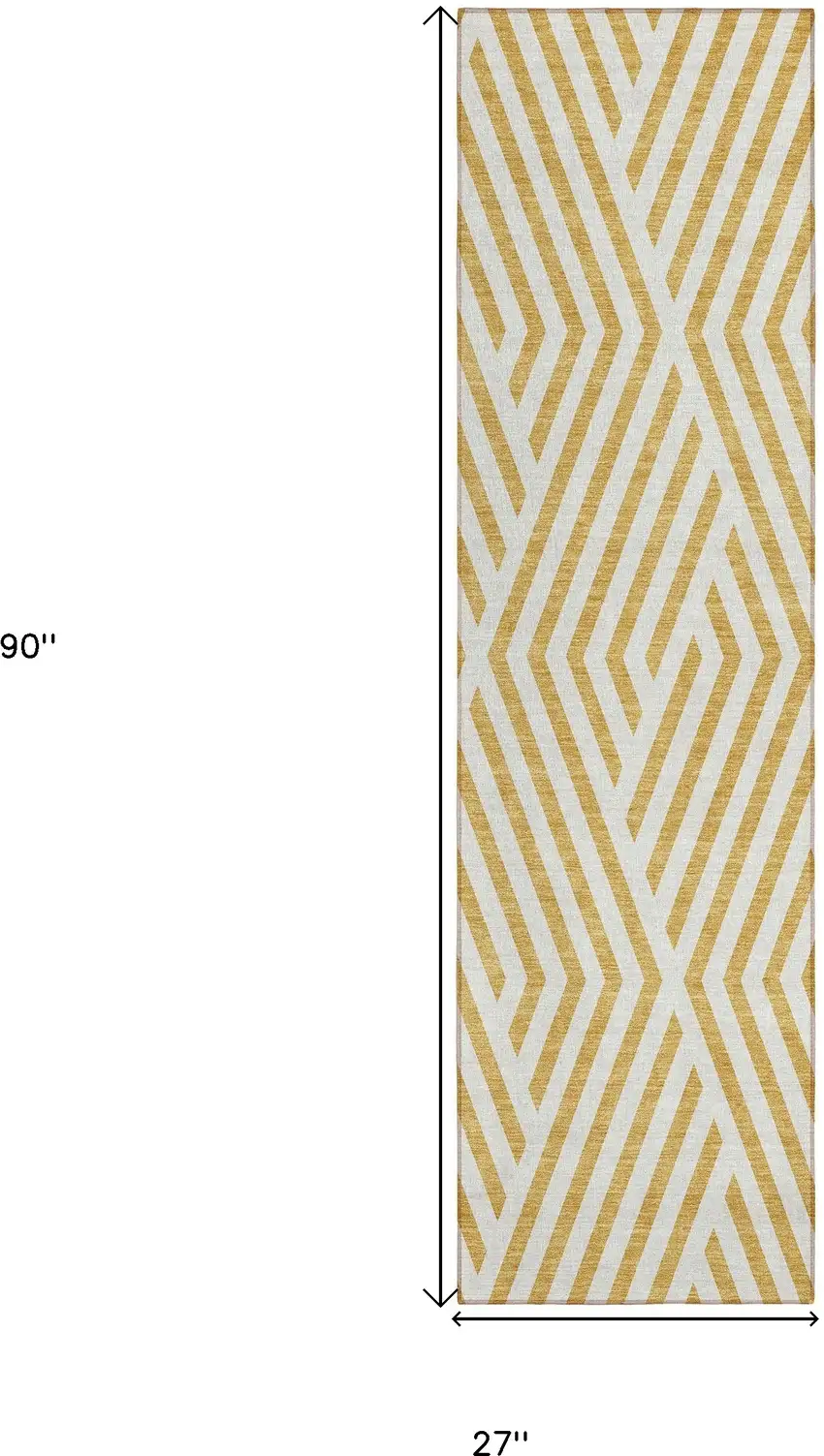 8' Runner Gold and White Geometric Washable Non Skid Indoor Outdoor Runner Rug