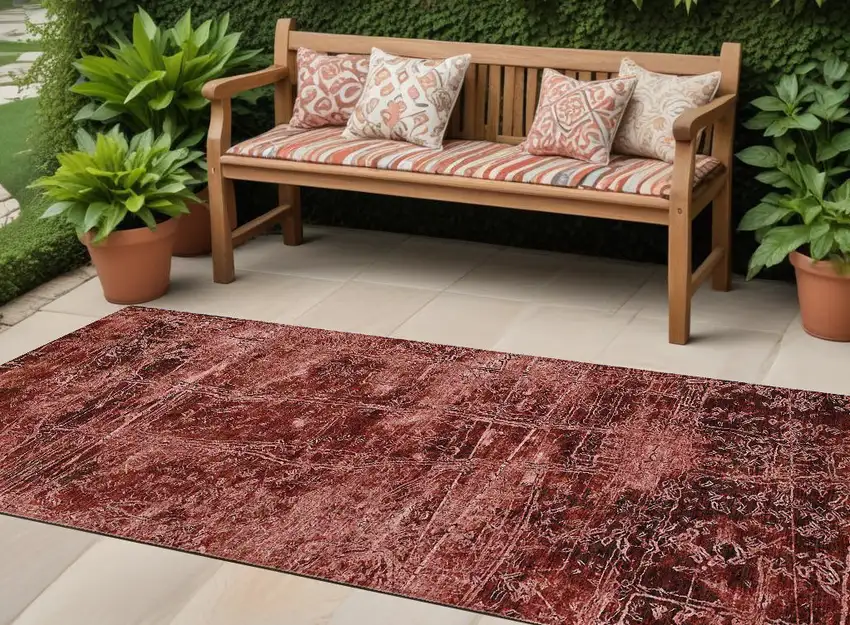 8' Runner Merlot Abstract Washable Non Skid Indoor Outdoor Runner Rug