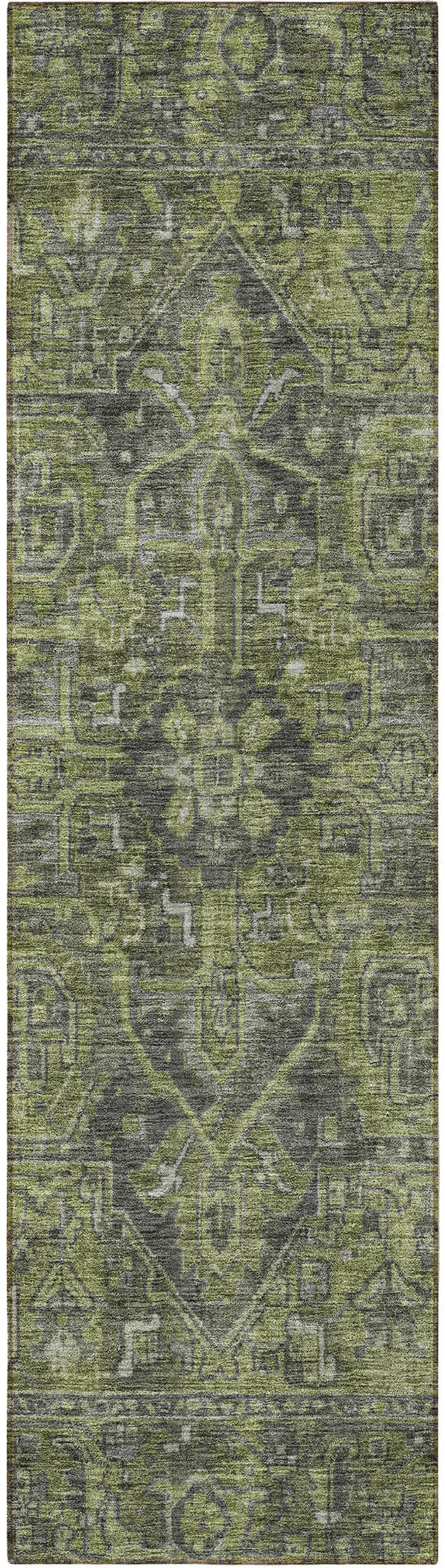 Set an inviting tone in your space with this 8-foot runner moss green and gray oriental washable stain resistant non skid indoor outdoor runner rug. This runner shaped rug features a oriental design in moss green and gray to give it visual interest. A classic shape marries with good looking design for your space ideal for spaces with kids and pets, this rug is stain resistant to help repel stains and spilled liquids. Area rugs help to give warmth and sense of home to your space. 27-inch H x 90-inch W x 0.19-inch D