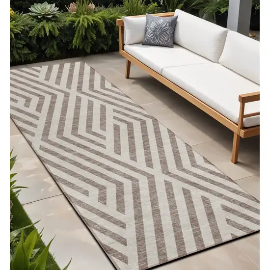 8' Runner Taupe and Ivory Geometric Washable Non Skid Indoor Outdoor Runner Rug