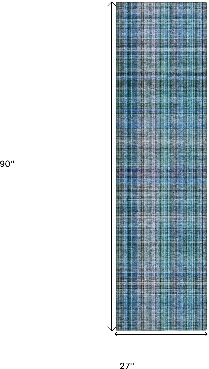8' Runner Teal Plaid Washable Non Skid Indoor Outdoor Runner Rug