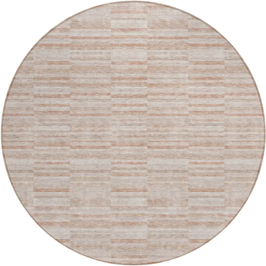 Add some artistry to your room with this 8-foot salmon copper and beige round striped washable indoor outdoor area rug. This geometric round shaped rug features a striped pattern in salmon, copper, and beige that combines a good looking print with a unique and updated shape. The mix of shape, color, and design gives this rug refreshing visual interest. Ideal for outdoor spaces or high traffic areas with kids and pets, this rug is made from heavy duty polyester that is stain resistant to help repel water, dirt, and stains. Versatile in use, durable, and easy to maintain, this rug is an ideal solution to add a decorative and inviting touch to your indoor or outdoor space. 96-inch h x 96-inch w x 0.19-inch d.