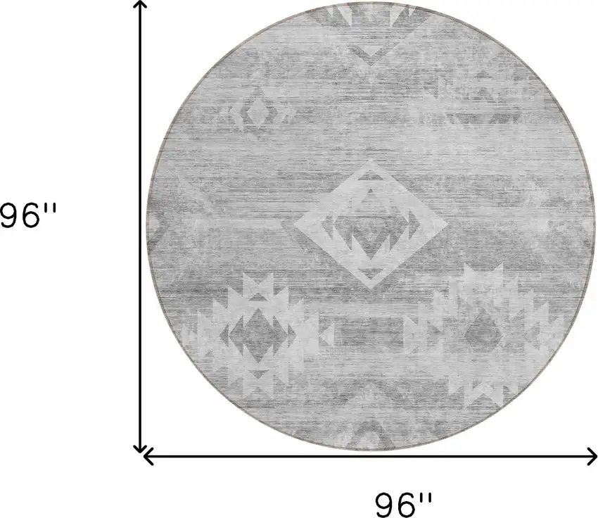 Set an inviting tone in your space with this 8-foot silver gray and charcoal round southwestern washable indoor outdoor area rug. This geometric round shaped rug features a southwestern pattern in silver, gray, and charcoal that combines a good looking print with a unique and updated shape. The mix of shape, color, and design gives this rug refreshing visual interest. Ideal for outdoor spaces or high traffic areas with kids and pets, this rug is made from heavy duty polyester that is stain resistant to help repel water, dirt, and stains. Makes a great way to dress up your patio, porch, or poolside, but also works well as a durable and easy to maintain option in the kitchen, family room, or mudroom. 96-inch h x 96-inch w x 0.19-inch d.