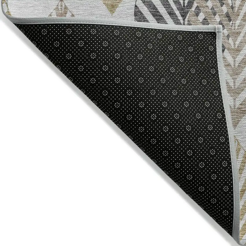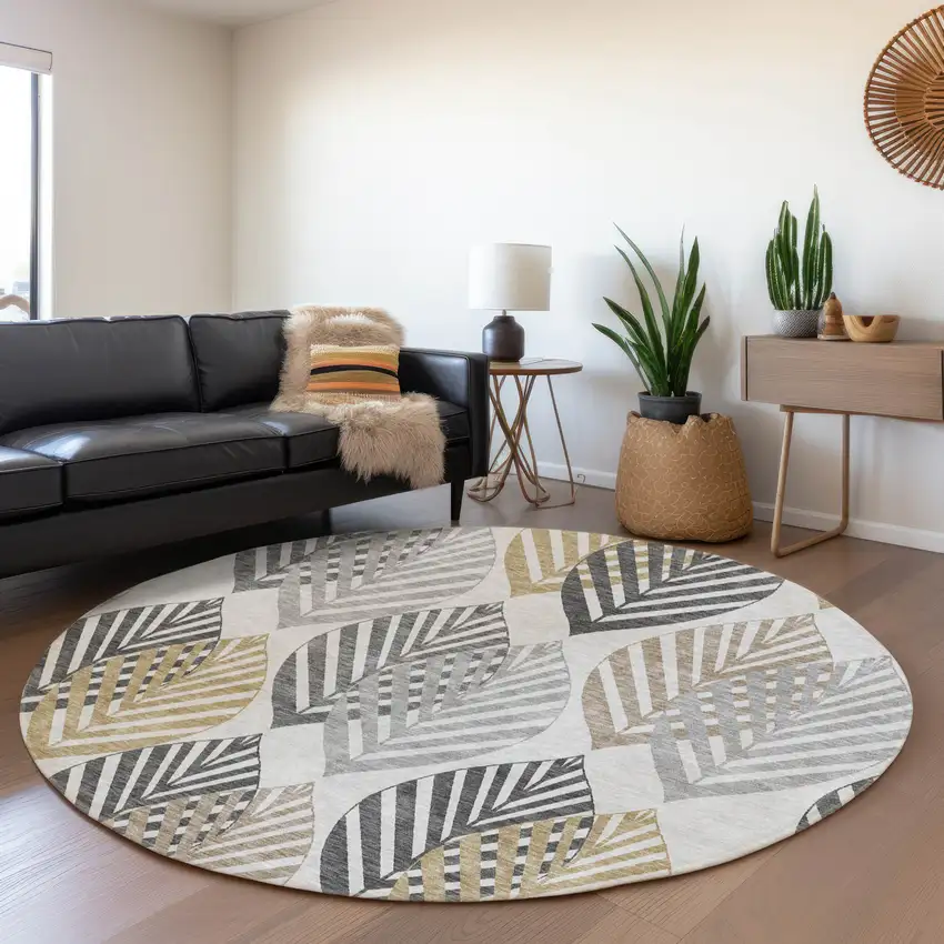 8' Silver Gray And Gold Round Floral Washable Indoor Outdoor Area Rug