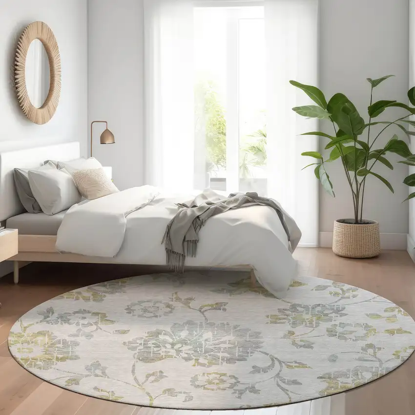 8' Silver Gray And Gold Round Floral Washable Indoor Outdoor Area Rug