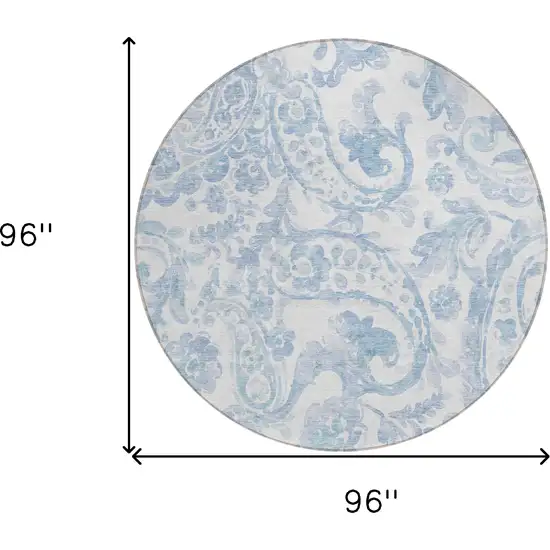 Set an inviting tone in your space with this 8-foot sky blue denim blue and ivory round paisley washable indoor outdoor area rug. This geometric round shaped rug features a paisley pattern in sky blue, denim blue, and ivory that combines a good looking print with a unique and updated shape. The mix of shape, color, and design gives this rug refreshing visual interest. Ideal for outdoor spaces or high traffic areas with kids and pets, this rug is made from heavy duty polyester that is stain resistant to help repel water, dirt, and stains. Versatile in use, durable, and easy to maintain, this rug is an ideal solution to add a decorative and inviting touch to your indoor or outdoor space. 96-inch h x 96-inch w x 0.19-inch d.