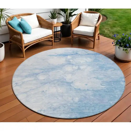 Add great coloration and comfortable texture to your space with this 8-foot sky blue denim blue and silver round abstract washable indoor outdoor area rug. This geometric round shaped rug features a abstract pattern in sky blue, denim blue, and silver that combines a good looking print with a unique and updated shape. The mix of shape, color, and design gives this rug refreshing visual interest. Ideal for outdoor spaces or high traffic areas with kids and pets, this rug is made from heavy duty polyester that is stain resistant to help repel water, dirt, and stains. Versatile in use, durable, and easy to maintain, this rug is an ideal solution to add a decorative and inviting touch to your indoor or outdoor space. 96-inch h x 96-inch w x 0.19-inch d.
