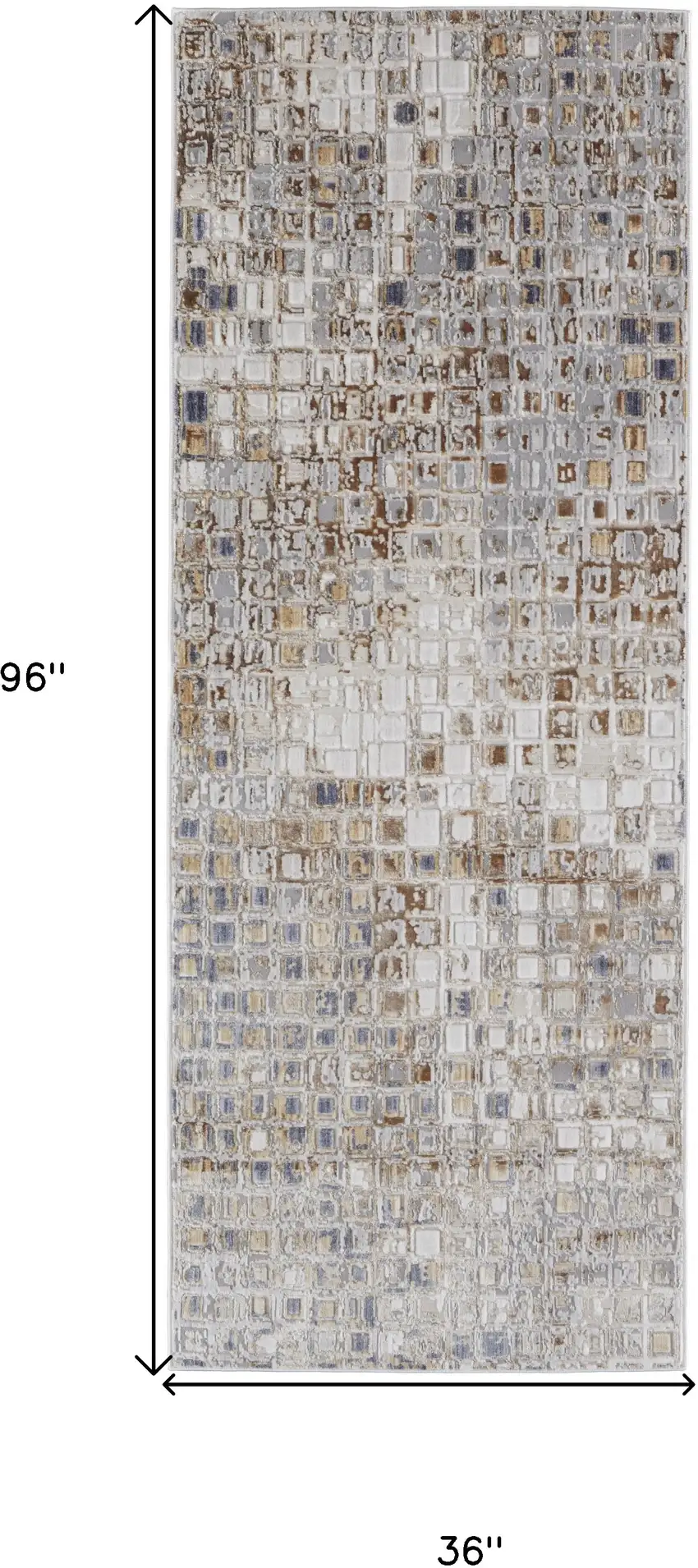 8' Tan Ivory And Blue Geometric Power Loom Distressed Runner Rug