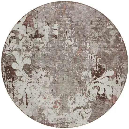 8' Taupe Ivory And Brown Round Damask Washable Indoor Outdoor Area Rug