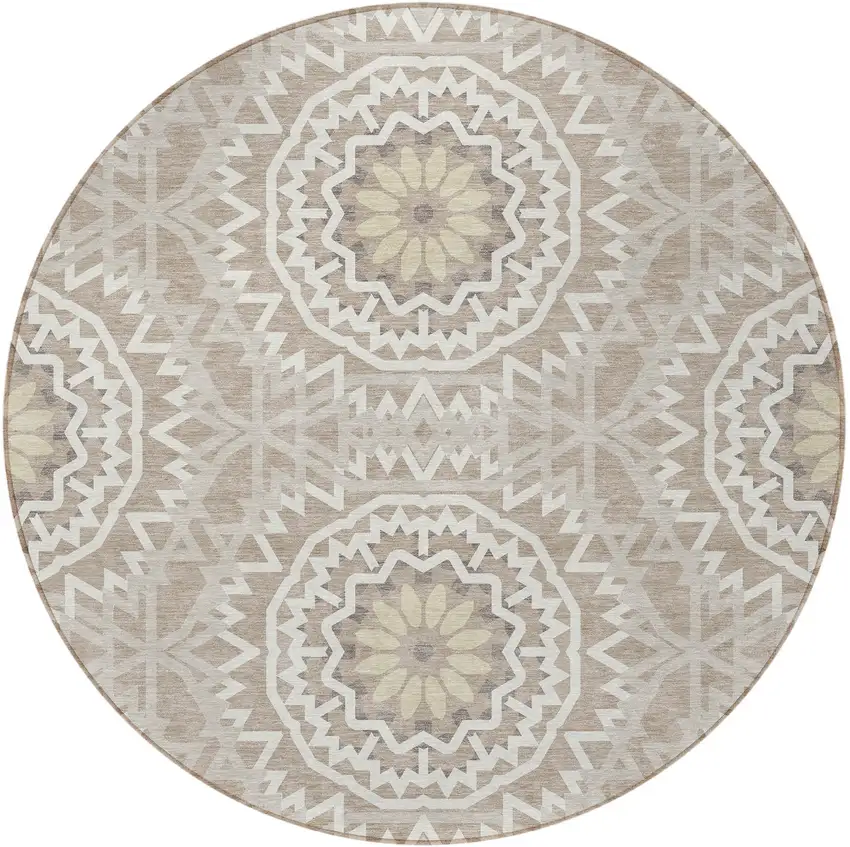 8' Taupe Khaki And Ivory Round Floral Medallion Washable Indoor Outdoor Area Rug
