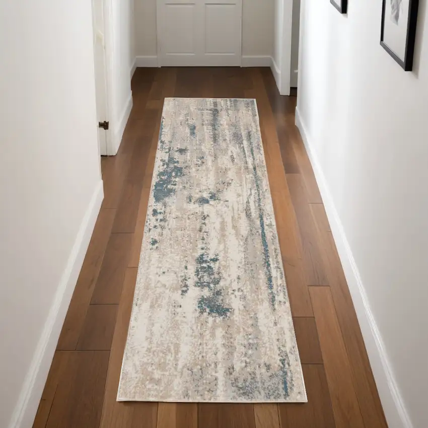8' Teal and Ivory Abstract Non Skid Runner Rug