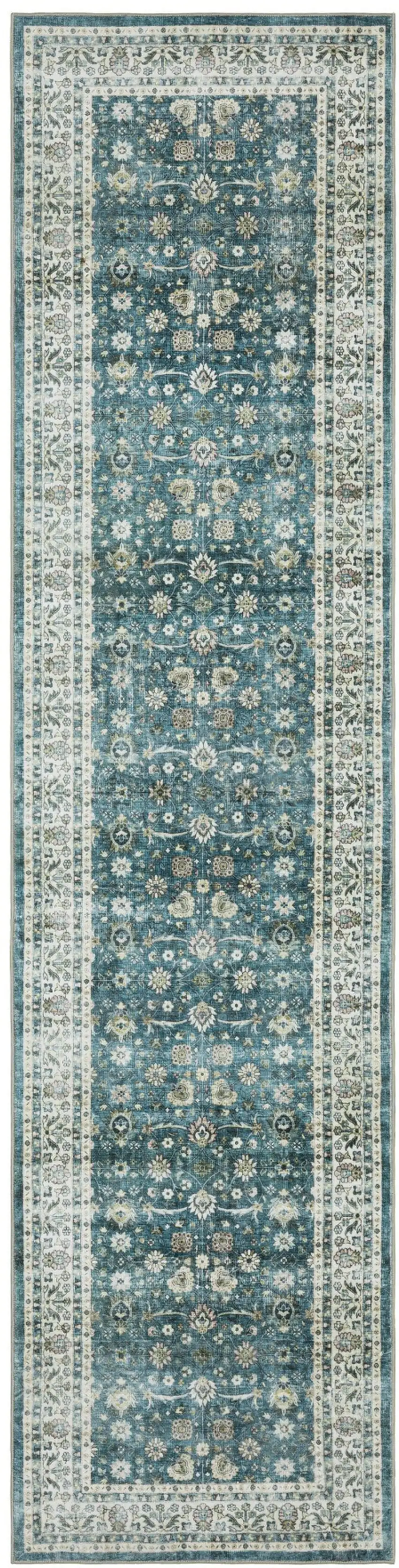 8' Teal And Ivory Oriental Distressed Runner Rug
