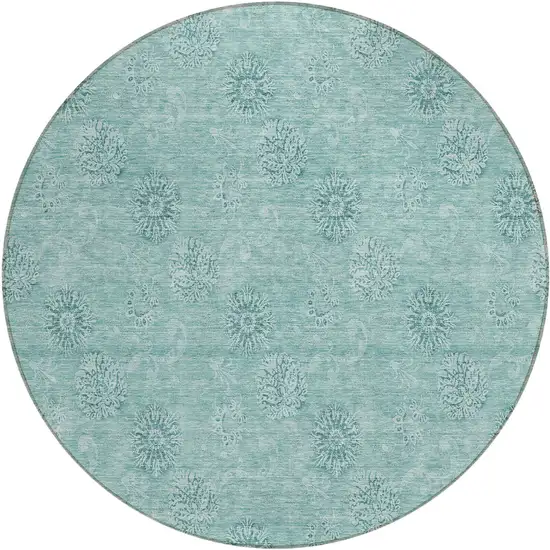 This 8-foot teal blue and ivory round floral washable indoor outdoor area rug, is a great way to add warmth to a room. This geometric round shaped rug features a floral pattern in teal blue and ivory that combines a good looking print with a unique and updated shape. The mix of shape, color, and design gives this rug refreshing visual interest. Ideal for outdoor spaces or high traffic areas with kids and pets, this rug is made from heavy duty polyester that is stain resistant to help repel water, dirt, and stains. Versatile in use, durable, and easy to maintain, this rug is an ideal solution to add a decorative and inviting touch to your indoor or outdoor space. 96-inch h x 96-inch w x 0.19-inch d.