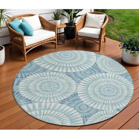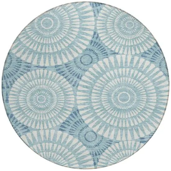 Add some artistry to your room with this 8-foot teal blue and ivory round geometric washable indoor outdoor area rug. This geometric round shaped rug features a geometric pattern in teal blue and ivory that combines a good looking print with a unique and updated shape. The mix of shape, color, and design gives this rug refreshing visual interest. Ideal for outdoor spaces or high traffic areas with kids and pets, this rug is made from heavy duty polyester that is stain resistant to help repel water, dirt, and stains. Versatile in use, durable, and easy to maintain, this rug is an ideal solution to add a decorative and inviting touch to your indoor or outdoor space. 96-inch h x 96-inch w x 0.19-inch d.