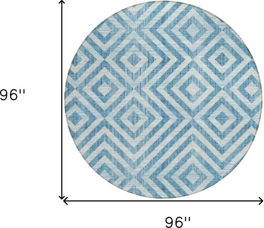 8' Teal Blue And Ivory Round Geometric Washable Indoor Outdoor Area Rug