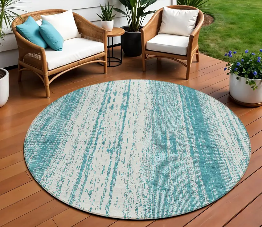 Add great coloration and comfortable texture to your space with this 8-foot teal blue and ivory round striped washable indoor outdoor area rug. This geometric round shaped rug features a striped pattern in teal blue and ivory that combines a good looking print with a unique and updated shape. The mix of shape, color, and design gives this rug refreshing visual interest. Ideal for outdoor spaces or high traffic areas with kids and pets, this rug is made from heavy duty polyester that is stain resistant to help repel water, dirt, and stains. Versatile in use, durable, and easy to maintain, this rug is an ideal solution to add a decorative and inviting touch to your indoor or outdoor space. 96-inch h x 96-inch w x 0.19-inch d.