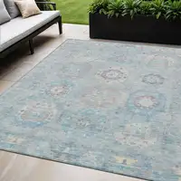 8' Teal Blue And Ivory Round Striped Washable Indoor Outdoor Area Rug