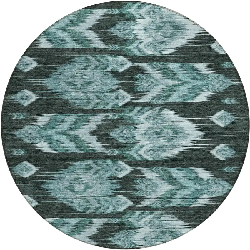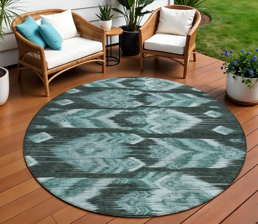 This 8-foot teal blue aqua and charcoal round southwestern washable indoor outdoor area rug, is a great way to add warmth to a room. This geometric round shaped rug features a southwestern pattern in teal blue, aqua, and charcoal that combines a good looking print with a unique and updated shape. The mix of shape, color, and design gives this rug refreshing visual interest. Ideal for outdoor spaces or high traffic areas with kids and pets, this rug is made from heavy duty polyester that is stain resistant to help repel water, dirt, and stains. Makes a great way to dress up your patio, porch, or poolside, but also works well as a durable and easy to maintain option in the kitchen, family room, or mudroom. 96-inch h x 96-inch w x 0.19-inch d.