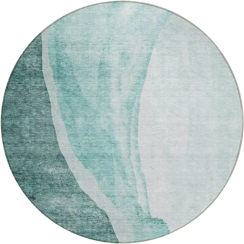 This 8-foot teal blue aqua and mint green round abstract washable indoor outdoor area rug, is a great way to add warmth to a room. This geometric round shaped rug features a abstract pattern in teal blue, aqua, and mint green that combines a good looking print with a unique and updated shape. The mix of shape, color, and design gives this rug refreshing visual interest. Ideal for outdoor spaces or high traffic areas with kids and pets, this rug is made from heavy duty polyester that is stain resistant to help repel water, dirt, and stains. Versatile in use, durable, and easy to maintain, this rug is an ideal solution to add a decorative and inviting touch to your indoor or outdoor space. 96-inch h x 96-inch w x 0.19-inch d.