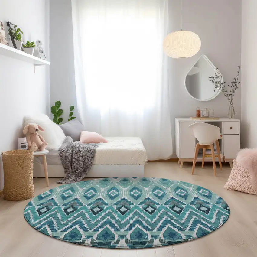 Set an inviting tone in your space with this 8-foot teal blue aqua and mint green round southwestern washable indoor outdoor area rug. This geometric round shaped rug features a southwestern pattern in teal blue, aqua, and mint green that combines a good looking print with a unique and updated shape. The mix of shape, color, and design gives this rug refreshing visual interest. Ideal for outdoor spaces or high traffic areas with kids and pets, this rug is made from heavy duty polyester that is stain resistant to help repel water, dirt, and stains. Versatile in use, durable, and easy to maintain, this rug is an ideal solution to add a decorative and inviting touch to your indoor or outdoor space. 96-inch h x 96-inch w x 0.19-inch d.