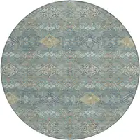 Add great coloration and comfortable texture to your space with this 8-foot teal blue gold and ivory round abstract washable indoor outdoor area rug. This geometric round shaped rug features a abstract pattern in teal blue, gold, and ivory that combines a good looking print with a unique and updated shape. The mix of shape, color, and design gives this rug refreshing visual interest. Ideal for outdoor spaces or high traffic areas with kids and pets, this rug is made from heavy duty polyester that is stain resistant to help repel water, dirt, and stains. Makes a great way to dress up your patio, porch, or poolside, but also works well as a durable and easy to maintain option in the kitchen, family room, or mudroom. 96.00-inch h x 96.00-inch w x 0.19-inch d.