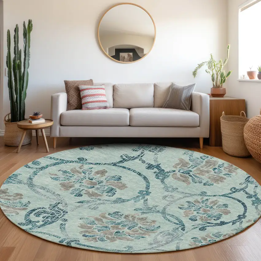 This 8-foot teal blue gray and aqua round floral washable indoor outdoor area rug, is a great way to add warmth to a room. This geometric round shaped rug features a floral pattern in teal blue, gray, and aqua that combines a good looking print with a unique and updated shape. The mix of shape, color, and design gives this rug refreshing visual interest. Ideal for outdoor spaces or high traffic areas with kids and pets, this rug is made from heavy duty polyester that is stain resistant to help repel water, dirt, and stains. Makes a great way to dress up your patio, porch, or poolside, but also works well as a durable and easy to maintain option in the kitchen, family room, or mudroom. 96-inch h x 96-inch w x 0.19-inch d.