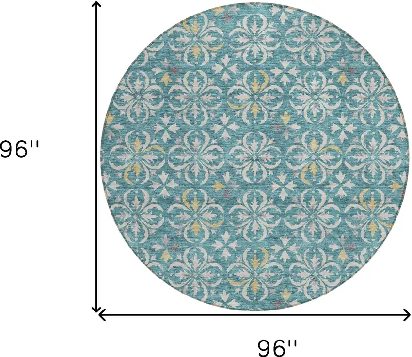 Add great coloration and comfortable texture to your space with this 8-foot teal blue gray and gold round floral washable indoor outdoor area rug. This geometric round shaped rug features a floral pattern in teal blue, gray, and gold that combines a good looking print with a unique and updated shape. The mix of shape, color, and design gives this rug refreshing visual interest. Ideal for outdoor spaces or high traffic areas with kids and pets, this rug is made from heavy duty polyester that is stain resistant to help repel water, dirt, and stains. Makes a great way to dress up your patio, porch, or poolside, but also works well as a durable and easy to maintain option in the kitchen, family room, or mudroom. 96-inch h x 96-inch w x 0.19-inch d.