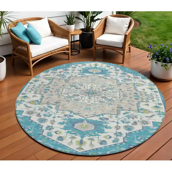 Set an inviting tone in your space with this 8-foot teal blue green and ivory round oriental washable indoor outdoor area rug. This geometric round shaped rug features a oriental pattern in teal blue, green, and ivory that combines a good looking print with a unique and updated shape. The mix of shape, color, and design gives this rug refreshing visual interest. Ideal for outdoor spaces or high traffic areas with kids and pets, this rug is made from heavy duty polyester that is stain resistant to help repel water, dirt, and stains. Makes a great way to dress up your patio, porch, or poolside, but also works well as a durable and easy to maintain option in the kitchen, family room, or mudroom. 96-inch h x 96-inch w x 0.19-inch d.