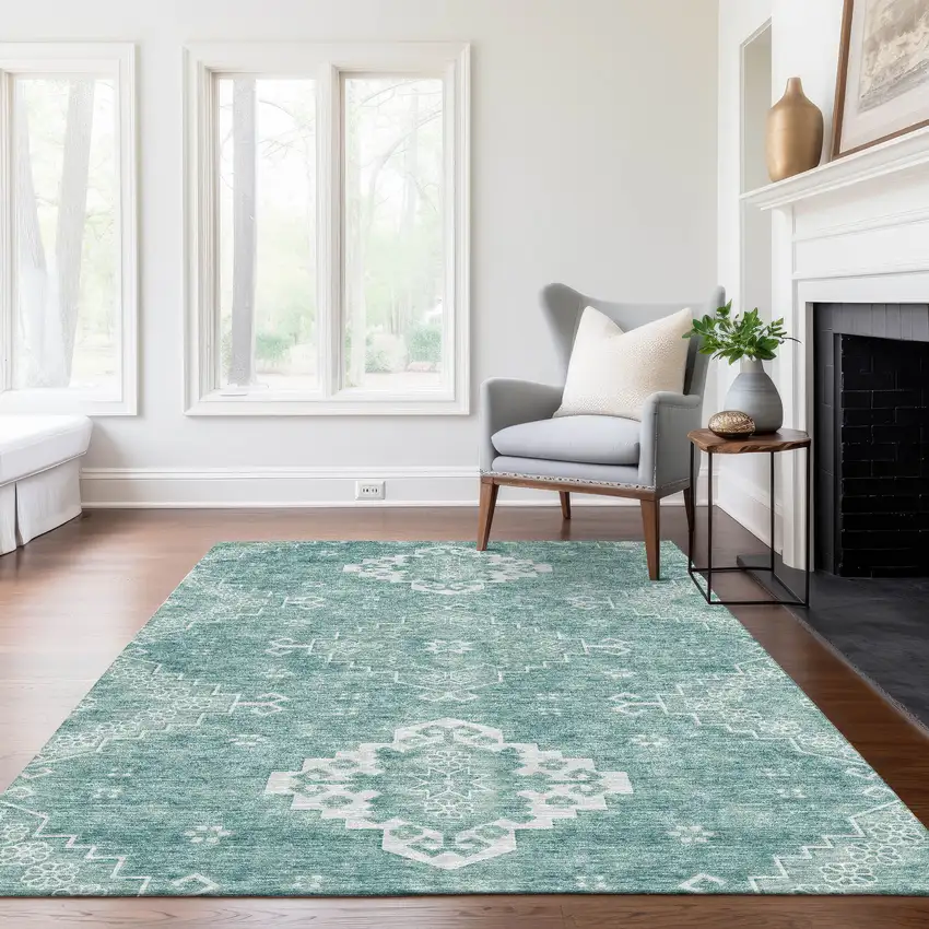 Add great coloration and comfortable texture to your space with this 10-foot x 14-foot aqua teal blue and ivory medallion washable indoor outdoor area rug. This rectangle shaped rug features a medallion design that will work well both indoors or out. A classic shape marries with good looking design for your living room, hall, bedroom, porch, patio, or poolside. Ideal for outdoor spaces or high traffic areas with kids and pets, this rug is made from heavy duty polyester that is stain resistant to help repel water, dirt, and stains. Versatile in use, durable, and easy to maintain, this rug is an ideal solution to add a decorative and inviting touch to your indoor or outdoor space. 120-inch h x 168-inch w x 0.19-inch d.