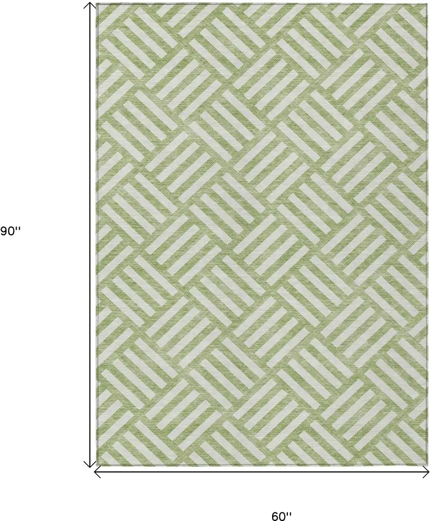 Add great coloration and comfortable texture to your space with this 5-foot x 8-foot artichoke green and ivory geometric washable indoor outdoor area rug. This rectangle shaped rug features a geometric design that will work well both indoors or out. A classic shape marries with good looking design for your living room, hall, bedroom, porch, patio, or poolside. Ideal for outdoor spaces or high traffic areas with kids and pets, this rug is made from heavy duty polyester that is stain resistant to help repel water, dirt, and stains. Makes a great way to dress up your patio, porch, or poolside, but also works well as a durable and easy to maintain option in the kitchen, family room, or mudroom. 60-inch h x 90-inch w x 0.19-inch d.
