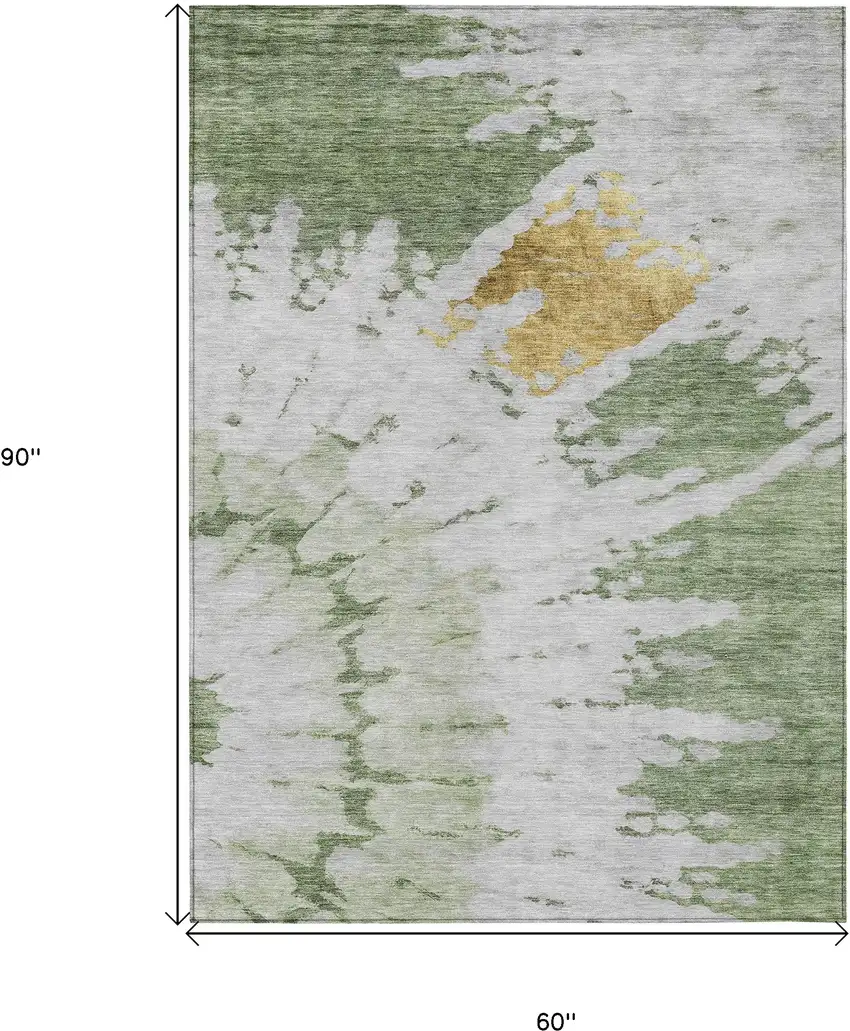 Add great coloration and comfortable texture to your space with this 5-foot x 8-foot artichoke green and olive green abstract washable indoor outdoor area rug. This rectangle shaped rug features a abstract design that will work well both indoors or out. A classic shape marries with good looking design for your living room, hall, bedroom, porch, patio, or poolside. Ideal for outdoor spaces or high traffic areas with kids and pets, this rug is made from heavy duty polyester that is stain resistant to help repel water, dirt, and stains. Makes a great way to dress up your patio, porch, or poolside, but also works well as a durable and easy to maintain option in the kitchen, family room, or mudroom. 60-inch h x 90-inch w x 0.19-inch d.