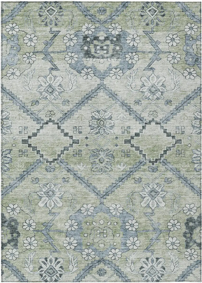 Set an inviting tone in your space with this 8-foot x 10-foot artichoke green denim blue and silver floral washable indoor outdoor area rug. This rectangle shaped rug features a floral design that will work well both indoors or out. A classic shape marries with good looking design for your living room, hall, bedroom, porch, patio, or poolside. Ideal for outdoor spaces or high traffic areas with kids and pets, this rug is made from heavy duty polyester that is stain resistant to help repel water, dirt, and stains. Versatile in use, durable, and easy to maintain, this rug is an ideal solution to add a decorative and inviting touch to your indoor or outdoor space. 96-inch h x 120-inch w x 0.19-inch d.