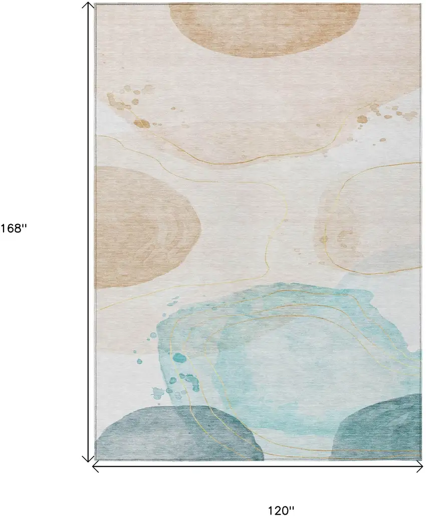 Set an inviting tone in your space with this 10-foot x 14-foot beige and blue abstract washable stain resistant non skid indoor outdoor area rug. This rectangle shaped rug features a abstract design in beige and blue to give it visual interest. A classic shape marries with good looking design for your space ideal for spaces with kids and pets, this rug is stain resistant to help repel stains and spilled liquids. Area rugs help to give warmth and sense of home to your space. 120-inch H x 168-inch W x 0.19-inch D