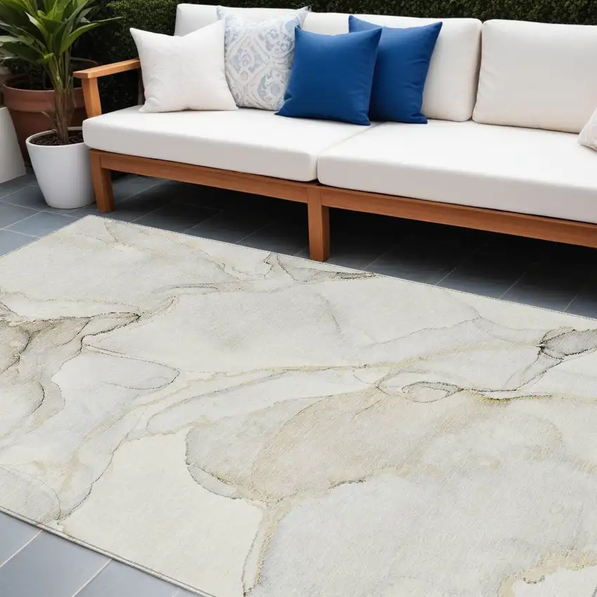 Add great coloration and comfortable texture to your space with this 8-foot x 10-foot beige and ivory abstract washable stain resistant non skid indoor outdoor area rug. This rectangle shaped rug features a abstract design in beige and ivory to give it visual interest. A classic shape marries with good looking design for your space ideal for spaces with kids and pets, this rug is stain resistant to help repel stains and spilled liquids. Area rugs help to give warmth and sense of home to your space. 96-inch H x 120-inch W x 0.19-inch D
