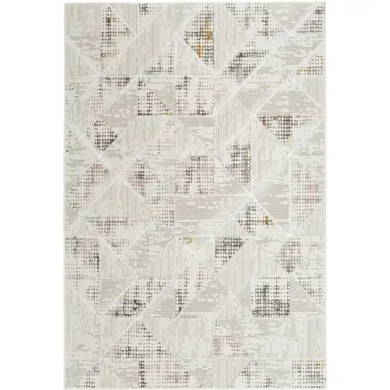 Set an inviting tone in your space with this 5-foot x 7-foot beige ivory and gray geometric non skid area rug. Ideal for spaces with kids and pets, this rug is stain resistant to help repel dirt and spilled liquids. Built to last, this rug crafted from polyester fibers is known for its durability and long lasting appeal. Rugs are a great way to showcase your style, hide imperfections, warm your home and reduce noise. This larger sized, contemporary styled rug is ready to create a focal point or statement piece in your room. 63-inch h x 87-inch w x 0.39-inch d