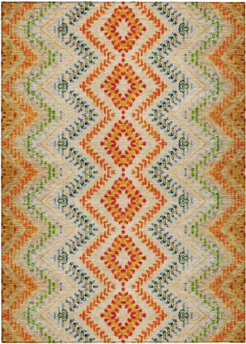 This 3-foot x 5-foot beige orange and red geometric washable indoor outdoor area rug, is a great way to add warmth to a room. This rectangle shaped rug features a geometric design that will work well both indoors or out. A classic shape marries with good looking design for your living room, hall, bedroom, porch, patio, or poolside. Ideal for outdoor spaces or high traffic areas with kids and pets, this rug is made from heavy duty polyester that is stain resistant to help repel water, dirt, and stains. Versatile in use, durable, and easy to maintain, this rug is an ideal solution to add a decorative and inviting touch to your indoor or outdoor space. 36-inch h x 60-inch w x 0.19-inch d.