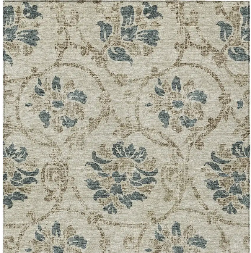 Beige Tan And Blue Floral Washable Indoor Outdoor Area Rug