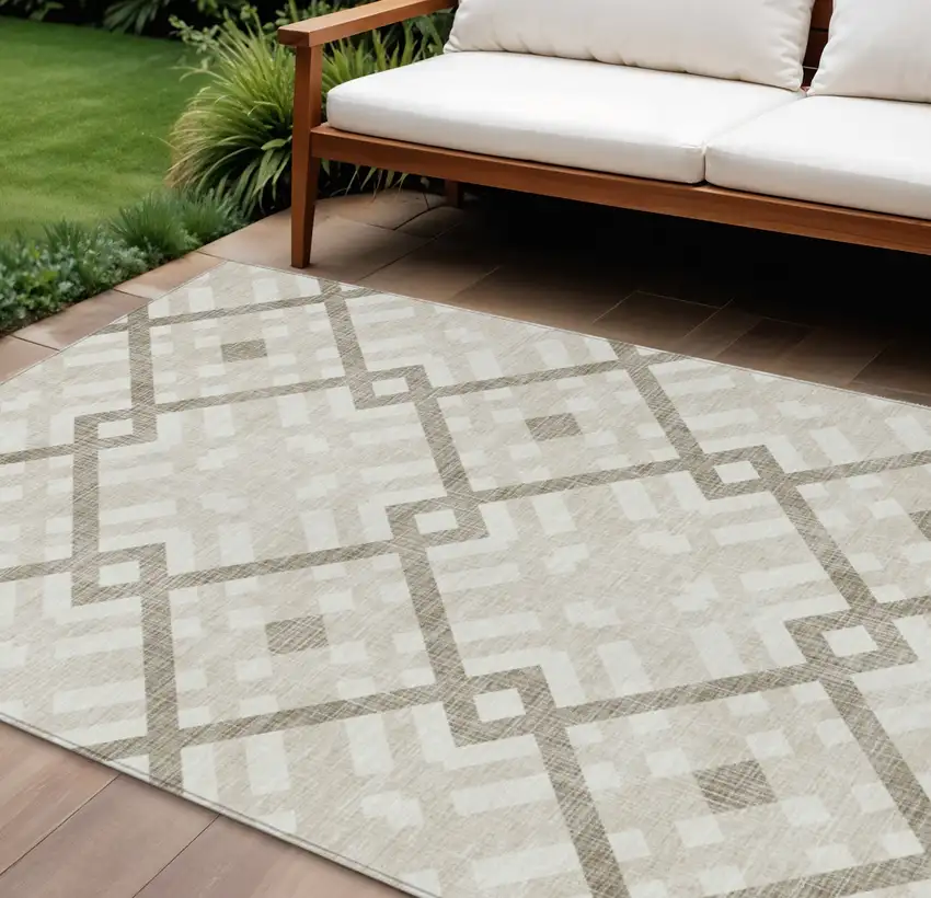 Add great coloration and comfortable texture to your space with this 9-foot x 12-foot beige tan and ivory geometric washable indoor outdoor area rug. This rectangle shaped rug features a geometric design that will work well both indoors or out. A classic shape marries with good looking design for your living room, hall, bedroom, porch, patio, or poolside. Ideal for outdoor spaces or high traffic areas with kids and pets, this rug is made from heavy duty polyester that is stain resistant to help repel water, dirt, and stains. Makes a great way to dress up your patio, porch, or poolside, but also works well as a durable and easy to maintain option in the kitchen, family room, or mudroom. 108-inch h x 144-inch w x 0.19-inch d.