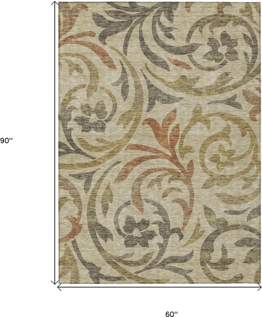 This 5-foot x 8-foot beige taupe and copper floral washable indoor outdoor area rug, is a great way to add warmth to a room. This rectangle shaped rug features a floral design that will work well both indoors or out. A classic shape marries with good looking design for your living room, hall, bedroom, porch, patio, or poolside. Ideal for outdoor spaces or high traffic areas with kids and pets, this rug is made from heavy duty polyester that is stain resistant to help repel water, dirt, and stains. Makes a great way to dress up your patio, porch, or poolside, but also works well as a durable and easy to maintain option in the kitchen, family room, or mudroom. 60-inch h x 90-inch w x 0.19-inch d.