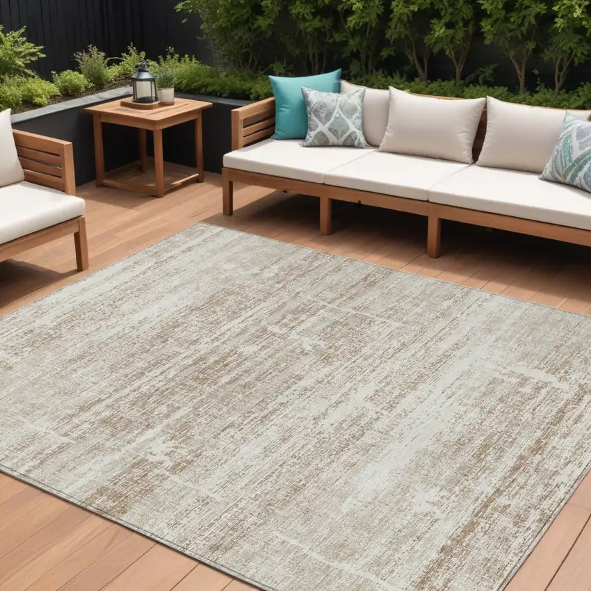This 9-foot x 12-foot beige taupe and ivory abstract washable indoor outdoor area rug, is a great way to add warmth to a room. This rectangle shaped rug features a abstract design that will work well both indoors or out. A classic shape marries with good looking design for your living room, hall, bedroom, porch, patio, or poolside. Ideal for outdoor spaces or high traffic areas with kids and pets, this rug is made from heavy duty polyester that is stain resistant to help repel water, dirt, and stains. Versatile in use, durable, and easy to maintain, this rug is an ideal solution to add a decorative and inviting touch to your indoor or outdoor space. 108-inch h x 144-inch w x 0.19-inch d.