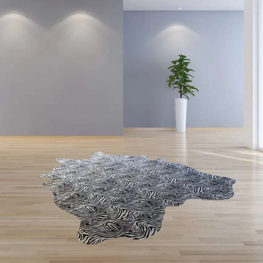 Not only does the Black and White Stenciled Baby Zebra Cowhide Rug introduce an element of nature into your home, but it also adds a touch of whimsy and adventure. Transform your space into a sanctuary inspired by the untamed beauty of the savannah. Let the rug's organic patterns transport you to the heart of Africa, evoking a sense of wonder and discovery.