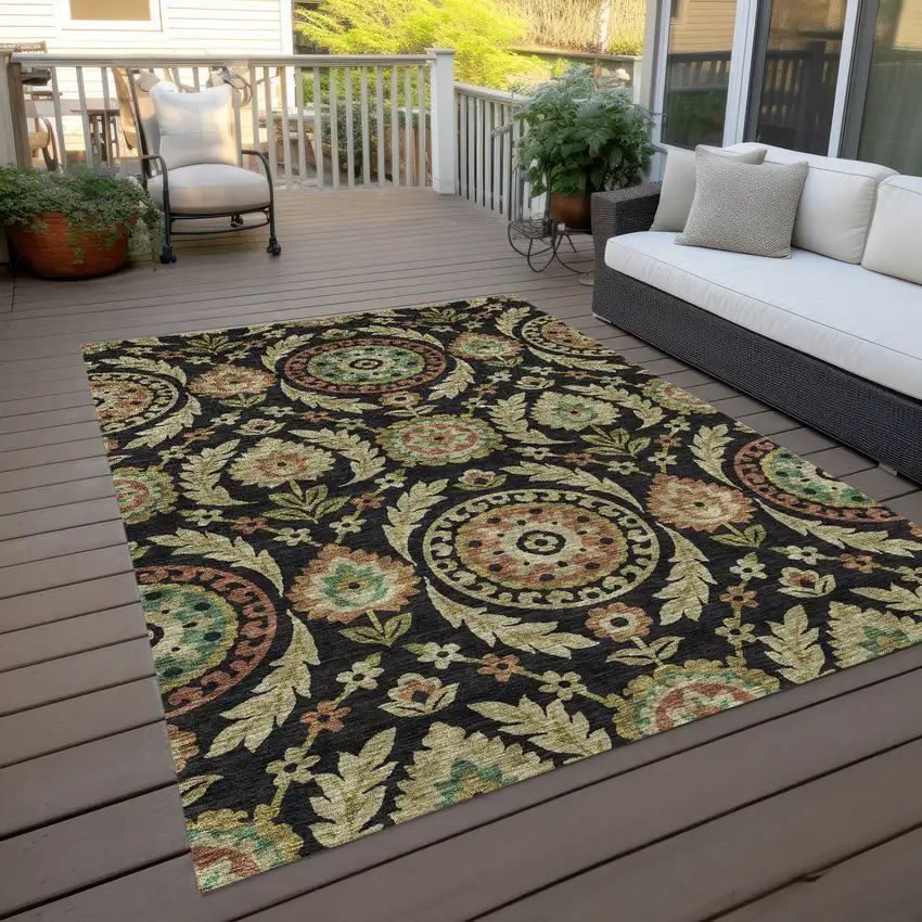 Add great coloration and comfortable texture to your space with this 9-foot x 12-foot black gold and copper floral washable indoor outdoor area rug. This rectangle shaped rug features a floral design that will work well both indoors or out. A classic shape marries with good looking design for your living room, hall, bedroom, porch, patio, or poolside. The coloration of this rug infuses an updated and modern vibe into your space. Ideal for outdoor spaces or high traffic areas with kids and pets, this rug is made from heavy duty polyester that is stain resistant to help repel water, dirt, and stains. Makes a great way to dress up your patio, porch, or poolside, but also works well as a durable and easy to maintain option in the kitchen, family room, or mudroom. 108-inch h x 144-inch w x 0.19-inch d.