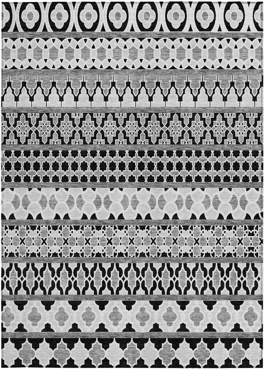Set an inviting tone in your space with this 9-foot x 12-foot black gray and ivory quatrefoil washable indoor outdoor area rug. This rectangle shaped rug features a quatrefoil design that will work well both indoors or out. A classic shape marries with good looking design for your living room, hall, bedroom, porch, patio, or poolside. The coloration of this rug infuses an updated and modern vibe into your space. Ideal for outdoor spaces or high traffic areas with kids and pets, this rug is made from heavy duty polyester that is stain resistant to help repel water, dirt, and stains. Makes a great way to dress up your patio, porch, or poolside, but also works well as a durable and easy to maintain option in the kitchen, family room, or mudroom. 108-inch h x 144-inch w x 0.19-inch d.